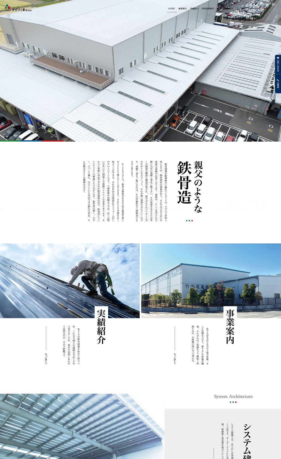 埼玉県吉川市のダイワ工業が手がけるのは工場や倉庫、そして店舗。それは、お客様の職場であり、大切な場所。それぞれのご依頼をどう解釈し料理するか、お客様の身になって考える。それがダイワ工業の建築会社としての仕事。 SEO・デザインにおいて、サイトユーザーにこだわりが伝わるサイトが求められた。
