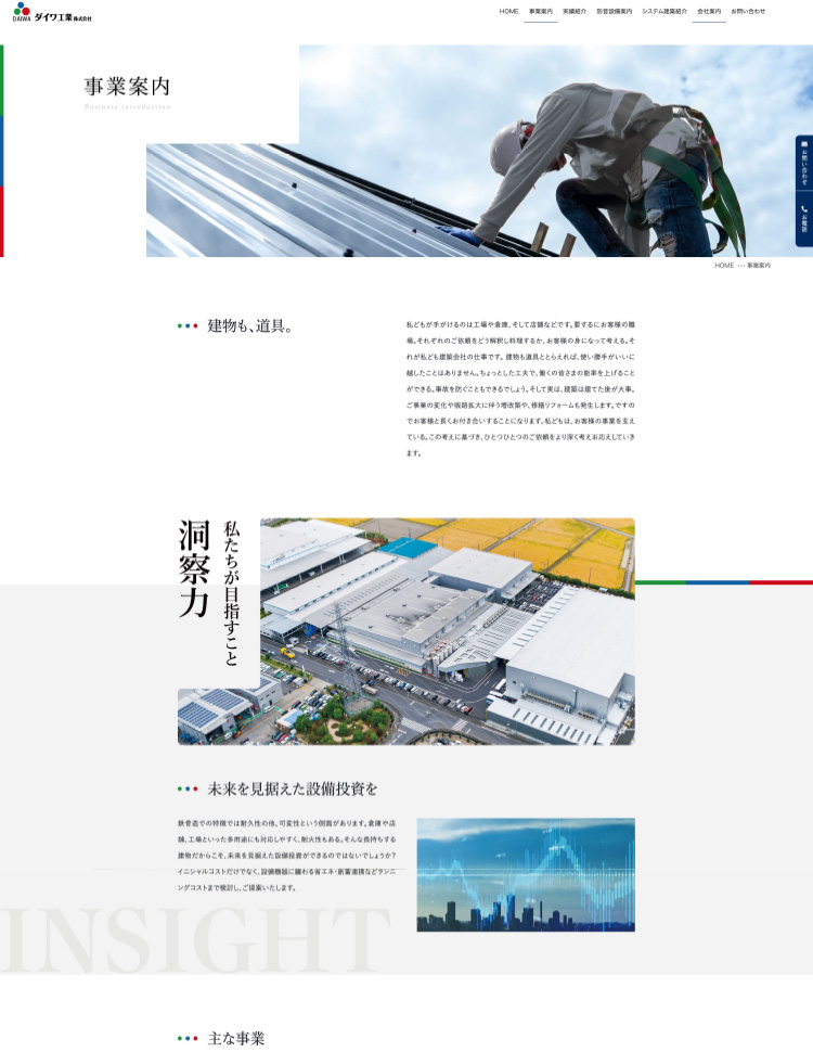 WEB集客を見据えたサイトリニューアル。SEO対策を含めたアフターフォローをどう行うかも焦点に当てた。ダイワ工業が手がけるのは工場や倉庫、そして店舗。それぞれのご依頼をどう解釈し料理するか、お客様の身になって考える。それがダイワ工業の建築会社としての仕事であり、ターゲットにとっての、わかりやすさとこだわりが伝わるサイトが求められた。