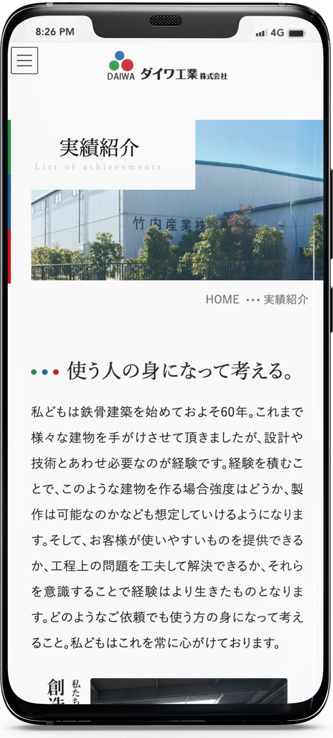ドローンを使用した動画撮影で、ダイワ工業の手がけた工場を撮影。ディティールを編集で見せながら建築物に対するダイワ工業のこだわりを表現。また、代表者のインタビューを掲載し、経営の指針を強く押し出し、縦書きのレイアウトを散りばめることで建築会社としての威厳や、存在感を演出。SEOサポートでは毎月ZOOM会議にて、月レポートを提出し、問題点を洗い出し、経営まで見据えたソリューションを提案。